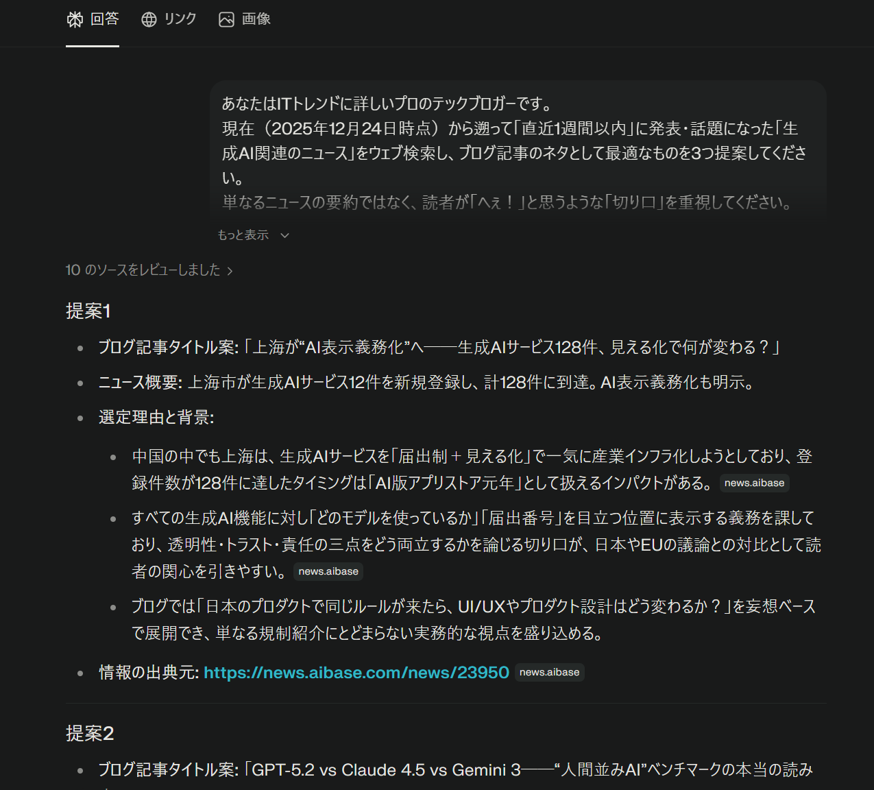 Perplexityは、大手メディアが大々的に報じる前の「GLM-4.7」や「上海のAI表示義務化」といった、エンジニアやテック通が好む具体的なネタをピンポイントで拾ってくれました。「他のブログと被らない、鋭い切り口」を見つけたい時、この検索能力は強力な武器になりそうです。