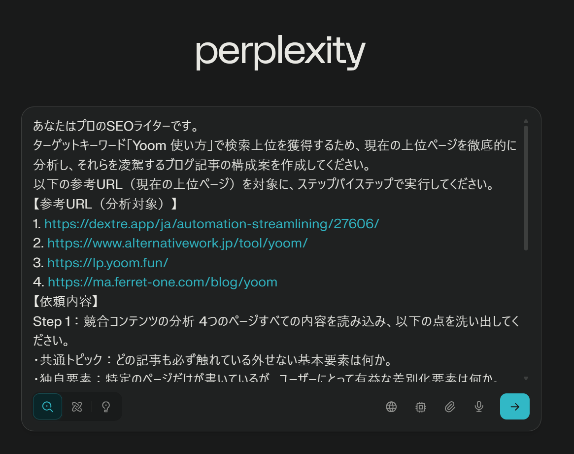 先ほどと同じように、プロンプトをPerplexityに入力します。