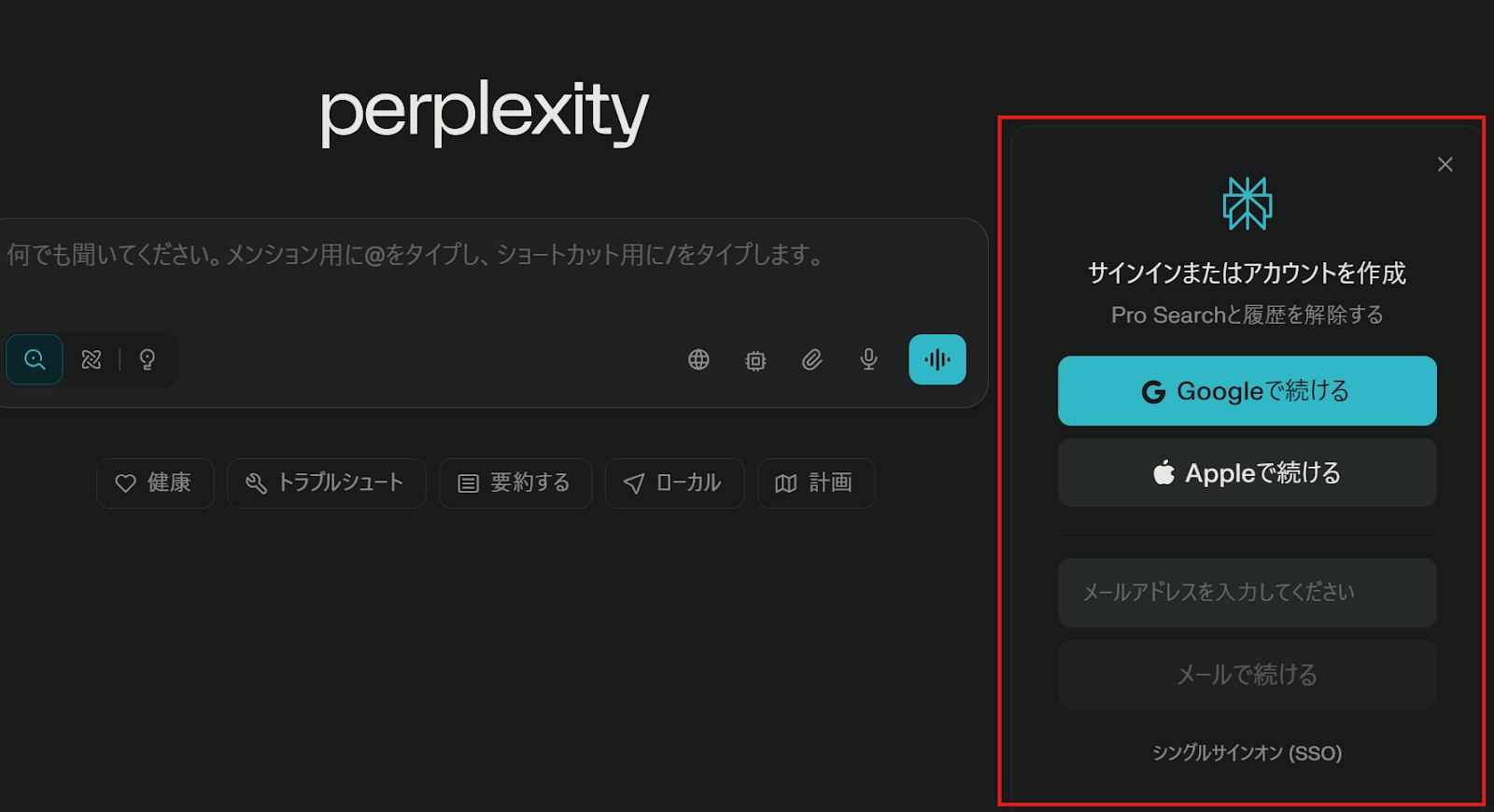 アカウントを既に持っている方は、公式サイトからPerplexityにログインします。