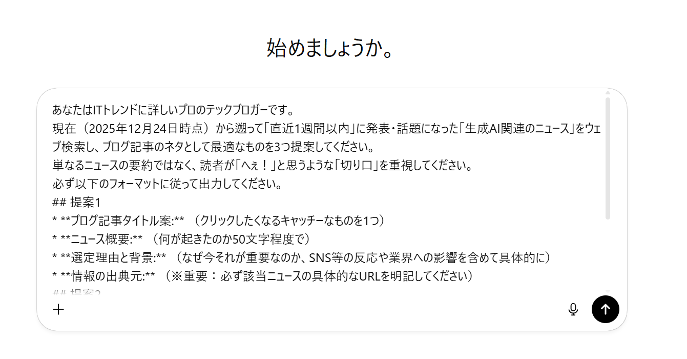 想定されるユースケース:「今、SNSやテック界隈で話題になっている生成AIのニュース」を検索し、ブログ記事のテーマ候補を3つ挙げてもらう。