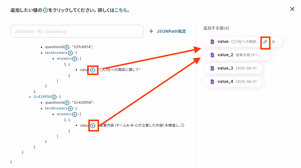 Yoomではアプリと連携するオペレーションで実行したAPIリクエストの結果はJSON形式のテキストで確認できるようになっており、特定のフォーマットでパスを記載することで、リクエスト結果のJSONテキストから任意の値を抽出することが可能です。