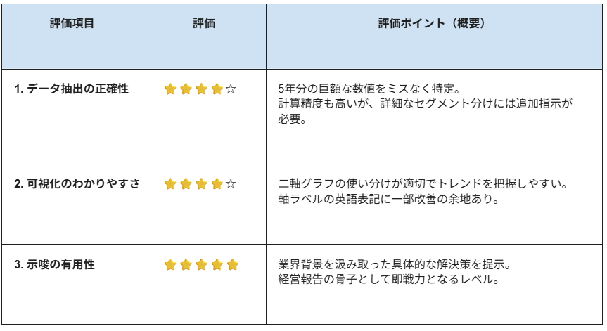 検証目的 膨大な財務資料(PDF)からのデータ抽出精度と、それに基づく可視化・戦略提言の質を測定し、AIが経営分析の補助として実務レベルで通用するかを評価する。