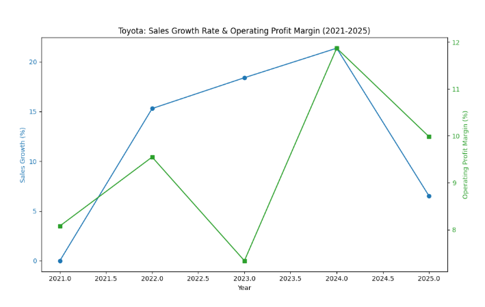 二軸グラフの活用: 「売上成長率(%)」と「営業利益率(%)」という、異なる性質の比率データを左右の軸(二軸)で適切に使い分け、推移の相関関係を明確にしています。直感的なデザイン: 青線(売上成長)と緑線(利益率)の色分け、およびプロット点の形状(丸と四角)の変化により、凡例を見ずとも各指標の動きを追うことが可能です。トレンドの強調: 2024年度の急伸から2025年度の鈍化・低下といった、経営上の「変化点」が視覚的に際立っており、分析レポートとしての機能を十分に果たしています。視認性: 軸ラベルやタイトルの英語表記など、一部改善の余地はありますが、実務におけるクイックな現状把握には十分なクオリティです。
