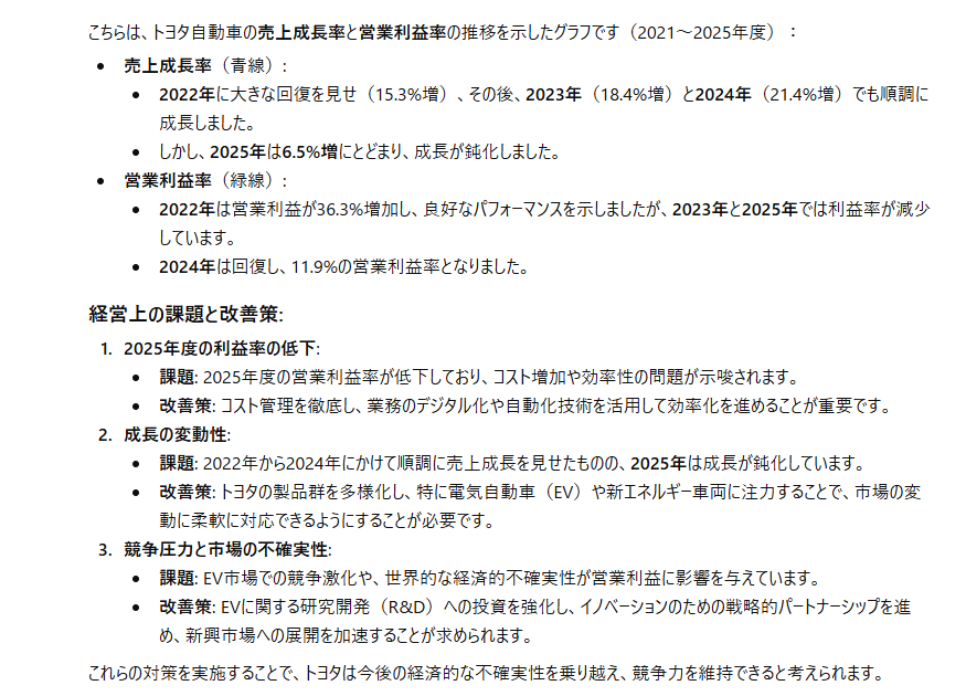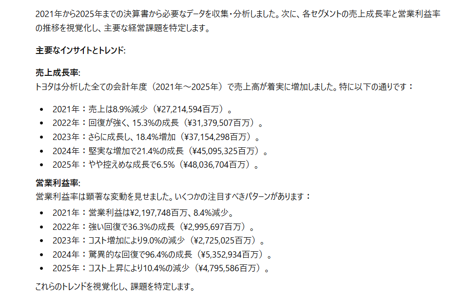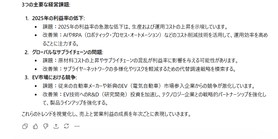 構造的な課題特定: 「2025年度の利益率低下」をコスト増や効率性の問題と結びつけ、単なる数字の指摘ではなく「経営課題」として昇華させています。ドメイン知識の活用: トヨタ自動車の事業背景を踏まえ、「EV市場での競争激化」や「サプライチェーンの多様化」など、自動車業界特有のコンテキストに沿った示唆が含まれています。解決策の具体性: 業務のデジタル化やAI・RPAの導入によるコスト削減 EV技術へのR&D投資加速と戦略的パートナーシップの構築 実務への貢献度: これらの提言は、経営会議の一次資料や、アナリストレポートの骨子としてそのまま活用できるレベルの論理構成を持っており、非常に有用と言えます。