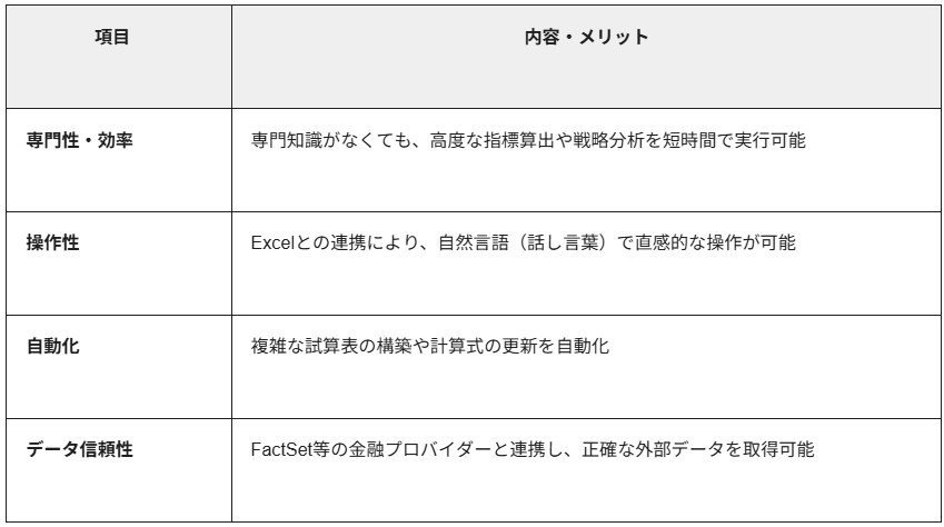 直感的な操作: 使い慣れたExcel上で、自然言語(話し言葉)による指示のみで操作可能モデリングの自動化: 複雑な試算表の構築や、複数シートにまたがる計算式の自動更新これらの進化により、ChatGPTは単なる対話型AIの域を超え、本格的な金融・財務アシスタント へと変貌を遂げています。