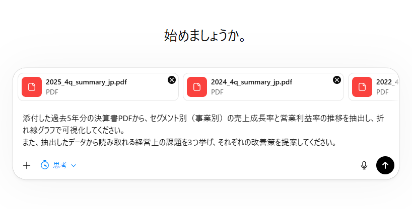 ステップ1: アップロードした資料から必要な数値(売上高や営業利益など)を抽出し、表にまとめる。ステップ2: 抽出したデータをもとに指標(売上高営業利益率など)を計算し、推移を分析する。ステップ3: 分析結果から考えられる経営課題を挙げ、具体的な改善策を提案させる。メリット: AIが文脈を見失うことなく、高い精度で論理的な分析を完遂できます。対話を通じて少しずつ深掘りしていく感覚を持つことが成功の秘訣です。