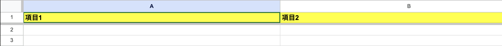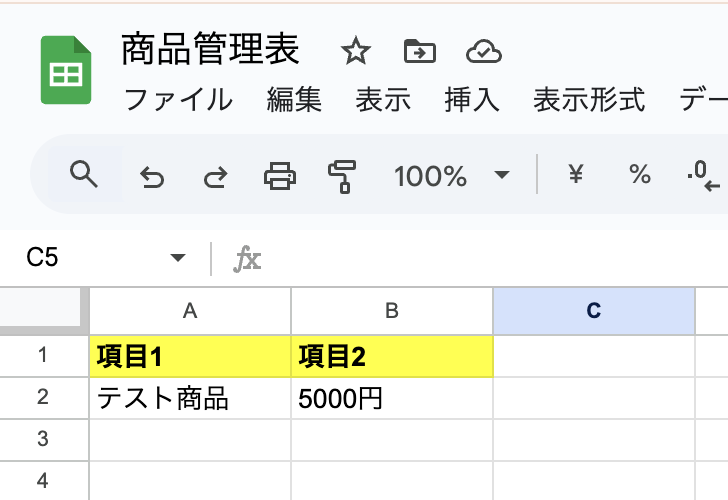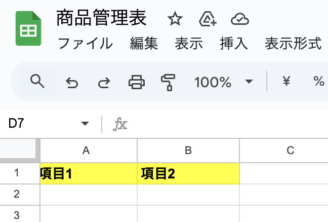 この項目1と項目2に商品名と単価を追加し、別のGoogle スプレッドシートのデータベースにコピーします。