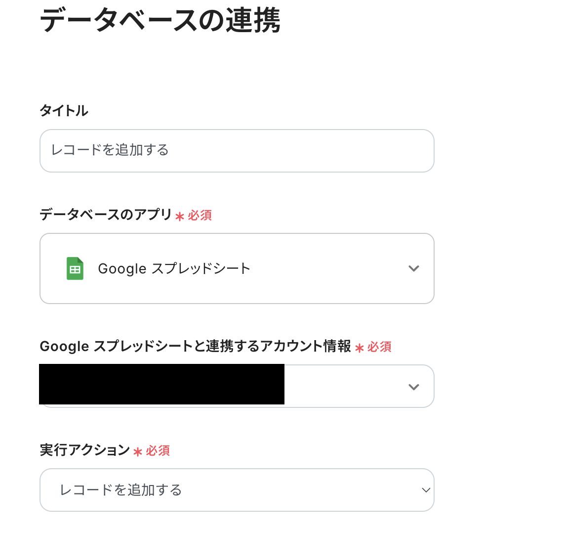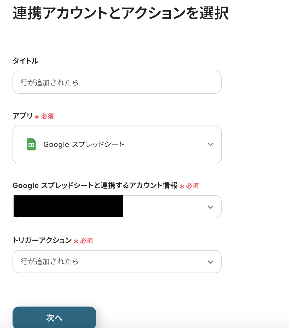 タイトルと連携するアカウント情報を任意で設定し、アクションはテンプレート通りのまま「次へ」をクリックして進んでください。