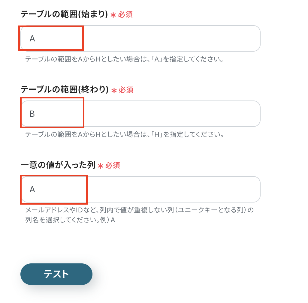 注:一意の値が入った列は必ず、値の重複しない列を設定してください。