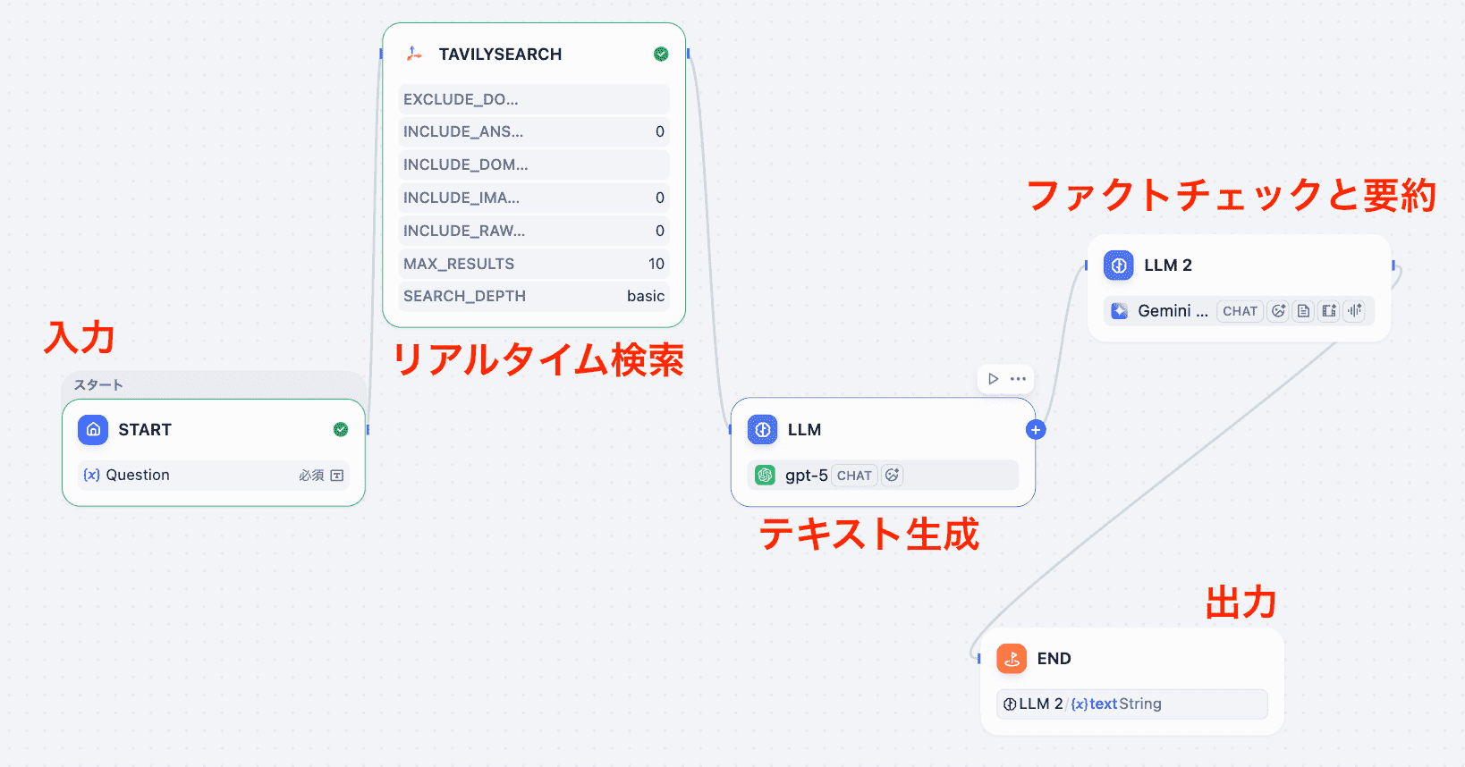 各ノードは自由に設定できるので、取得したい情報がどんなものかを考えつつ設定してくださいね。(リサーチツールの詳細設定やLLMへのプロンプト など)