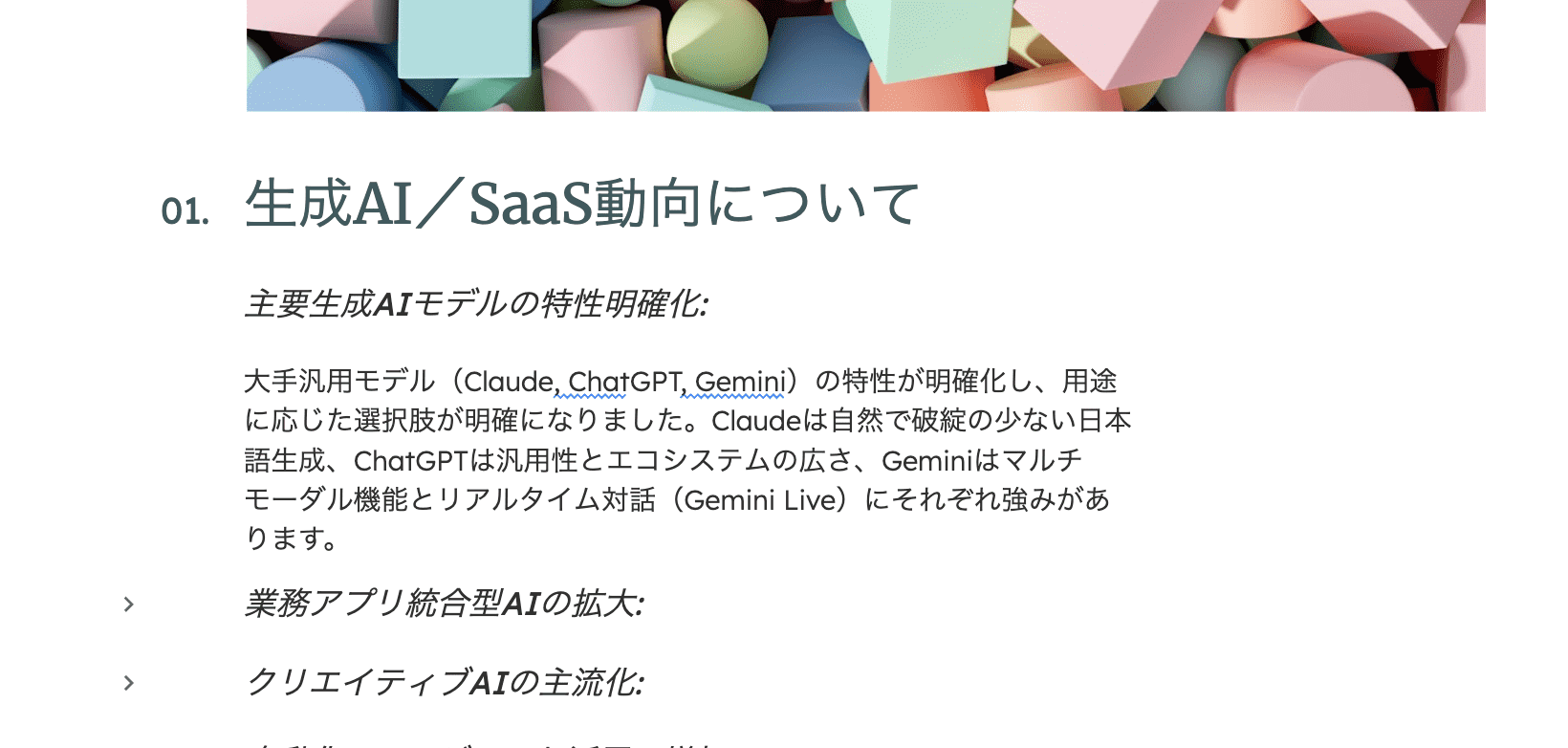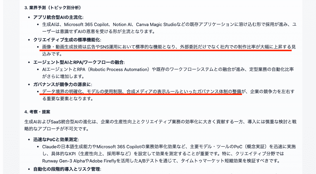 主要な生成AIツールとして広く普及しているものから、音楽生成や音声合成といった専門分野に優れたツールの最新の傾向がまとめられており、『生成技術が企業で標準化しつつあること』『ガバナンス整備が重要』と、トピック別の業界予測(赤線)も記されています。