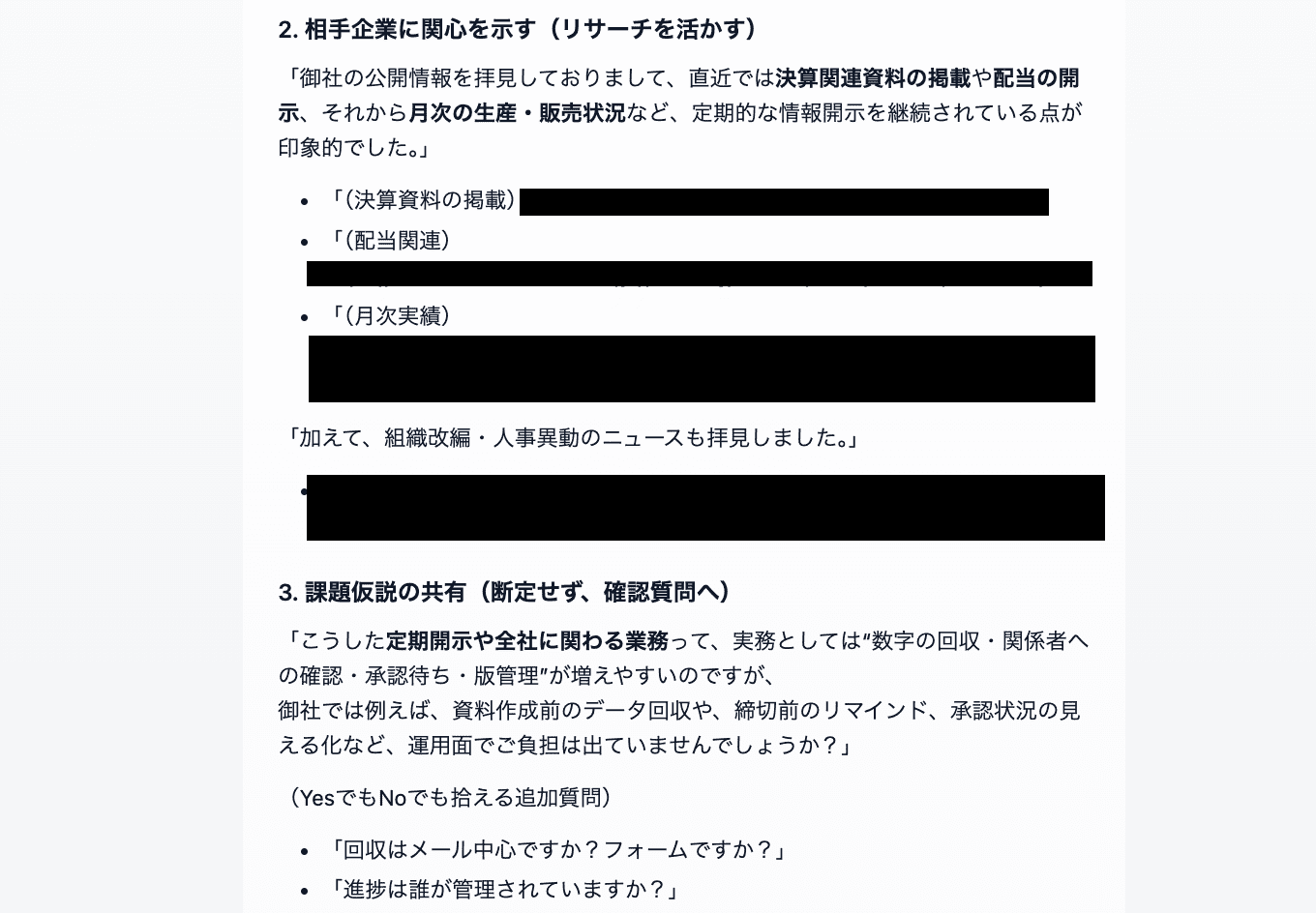 ②対象企業の最新動向や公式の情報を正しく読み取り、誤情報のない情報を抽出→その後の資料作成で活かせる有効な情報で構成されているかを確認