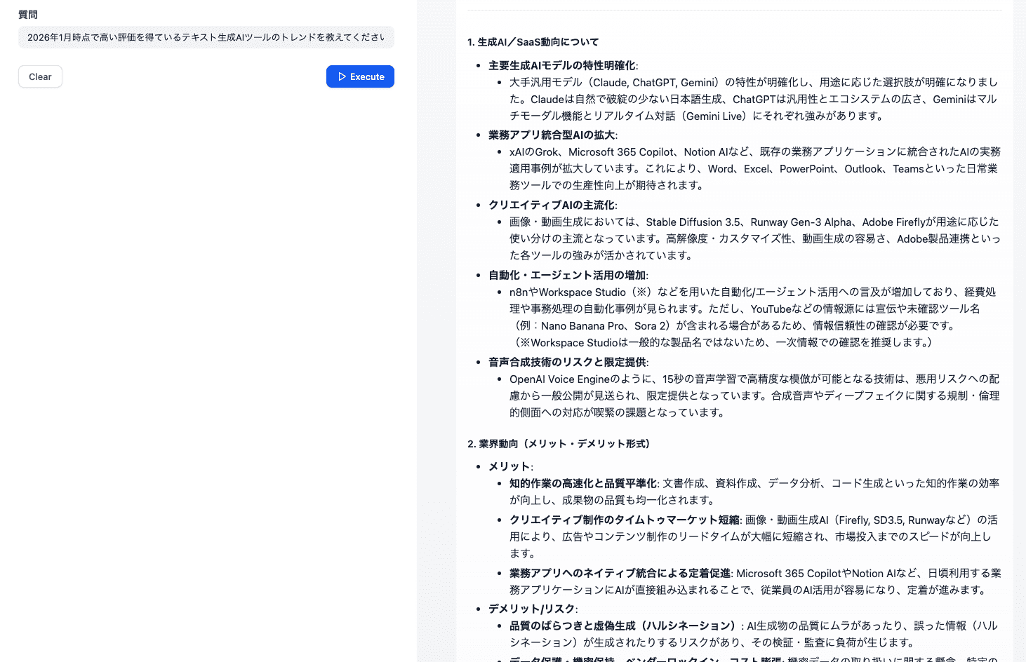 事業開発担当者が、「生成AI トレンド」「SaaS 業界動向」などのテーマで週次レポートを作成し、社内共有する、という検証シーンを想定しています。