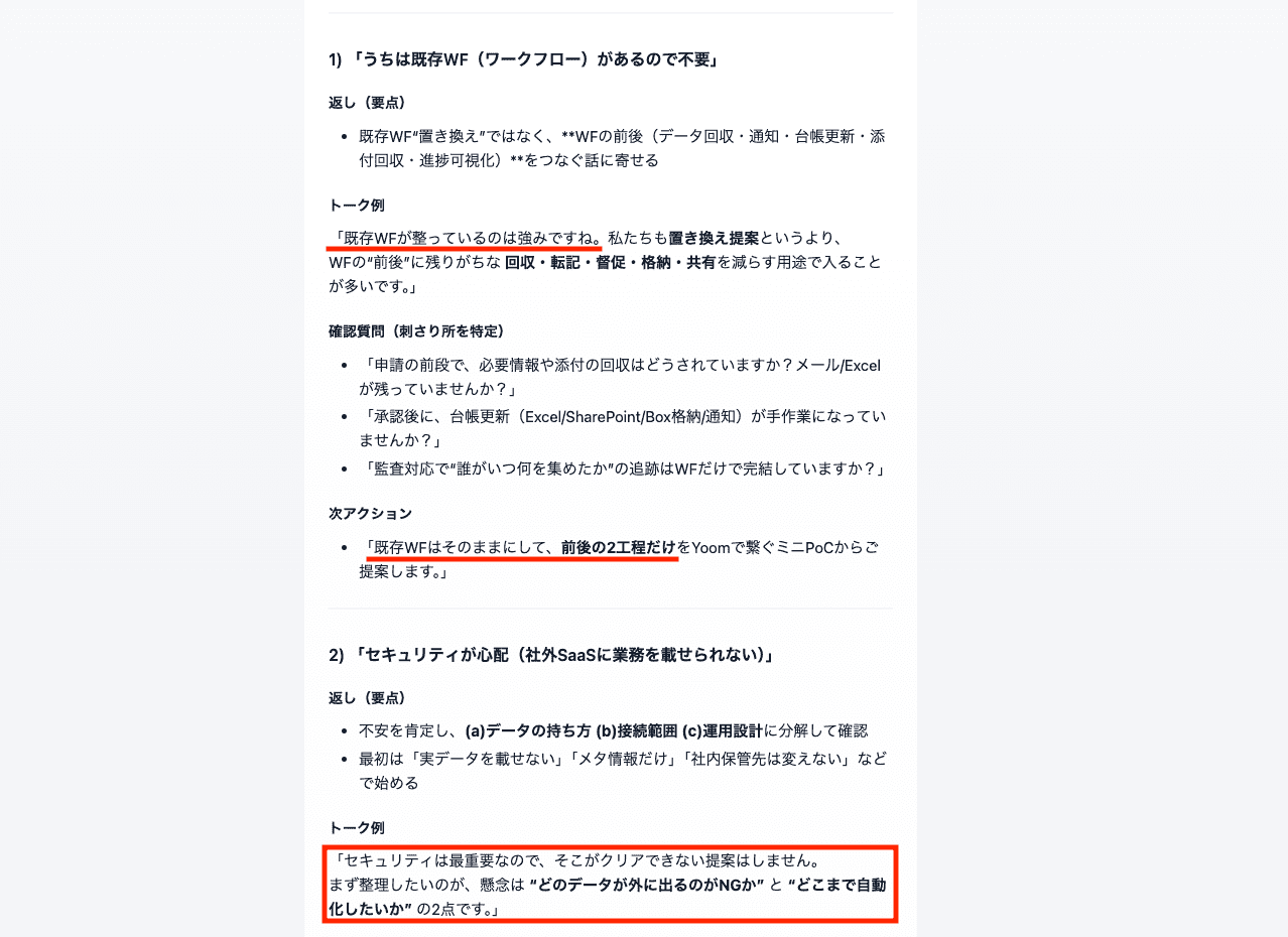 トーク集の構成も問題ないクオリティで提案されているため、担当者のチェックや修正も少ない工数で済みそうです。
