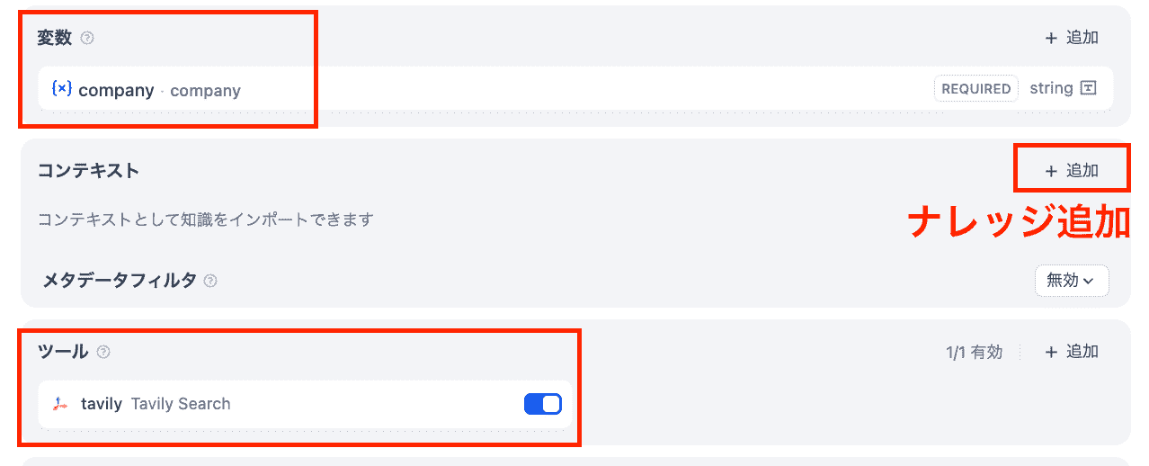 そのあと、変数や社内ナレッジ、ツール(Tavily Search)を追加して公開します。