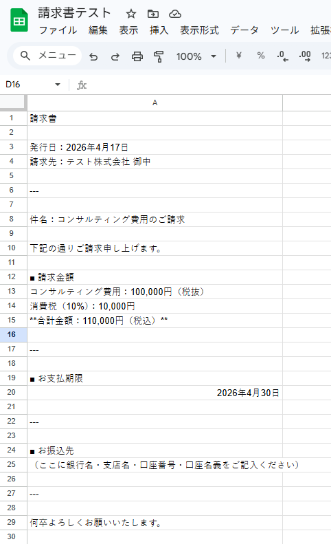 すると、請求先、発行日、品目、単価、税額、合計金額などを含んだ、請求書のたたき台が短時間で出力されました。内容の整理という観点では、実務の土台として十分参考になるレベルです。