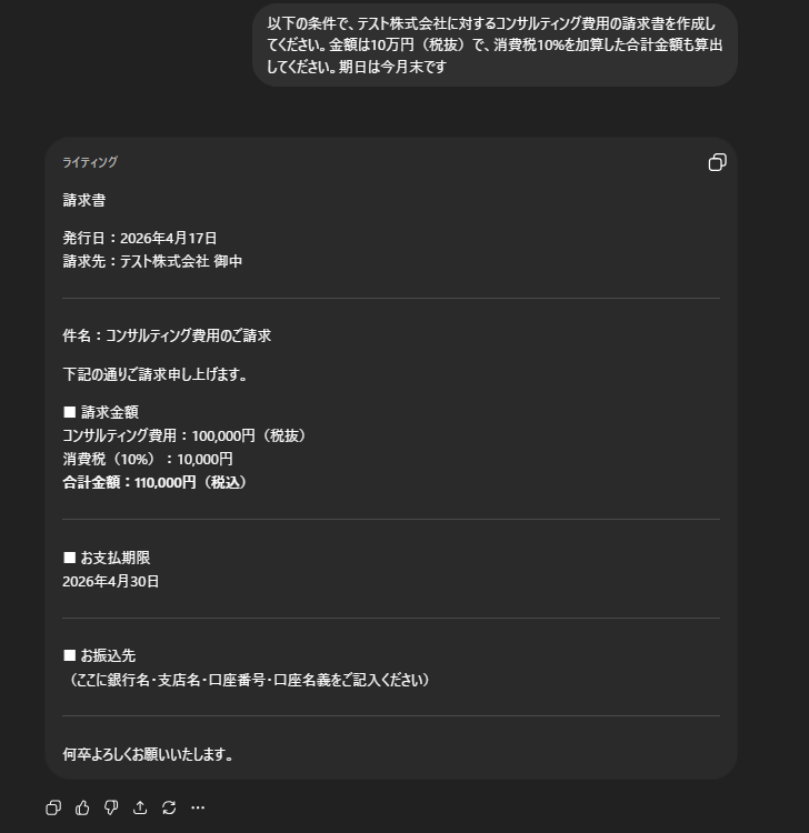 まずは、プロンプトとして 「以下の条件で、〇〇株式会社に対するコンサルティング費用の請求書を作成してください。金額は10万円(税抜)で、消費税10%を加算した合計金額も算出してください。期日は今月末です」 と入力します。