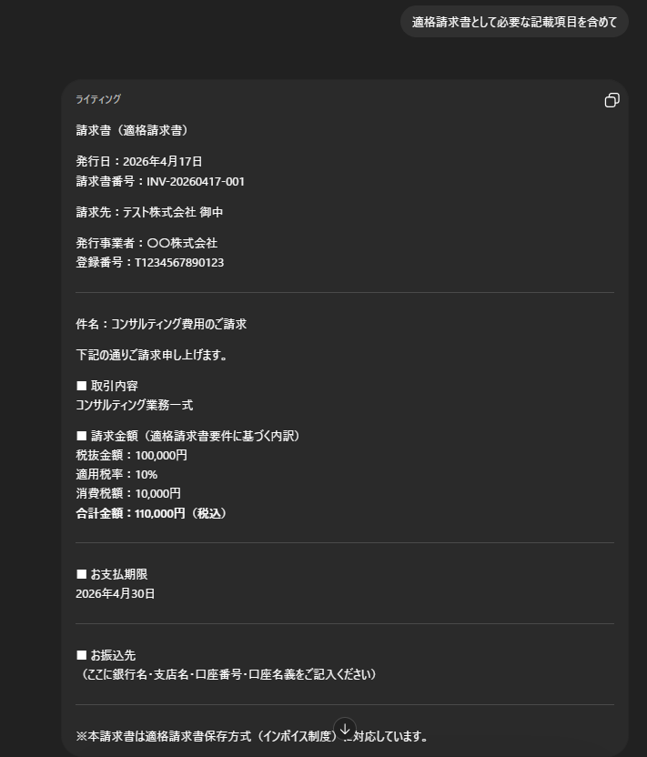 また、日本の実務で重要となるインボイス制度を意識した記載を盛り込みたい場合は、「適格請求書として必要な記載項目を含めて」といった指示を加えることで、必要項目を意識した下書きを作ることも可能です。