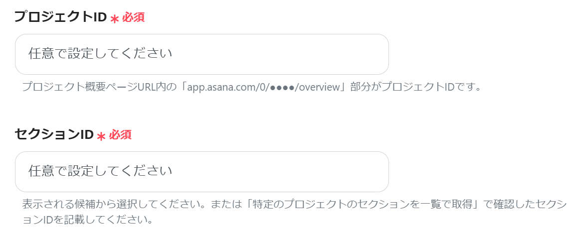 スクロールし、説明を確認して「プロジェクトID」と「セクションID」を設定してください。