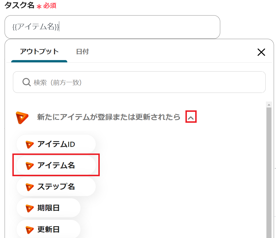 赤枠内の矢印をクリックすると、Brushupのアウトプットが表示されるので、「アイテム名」を選択しましょう。