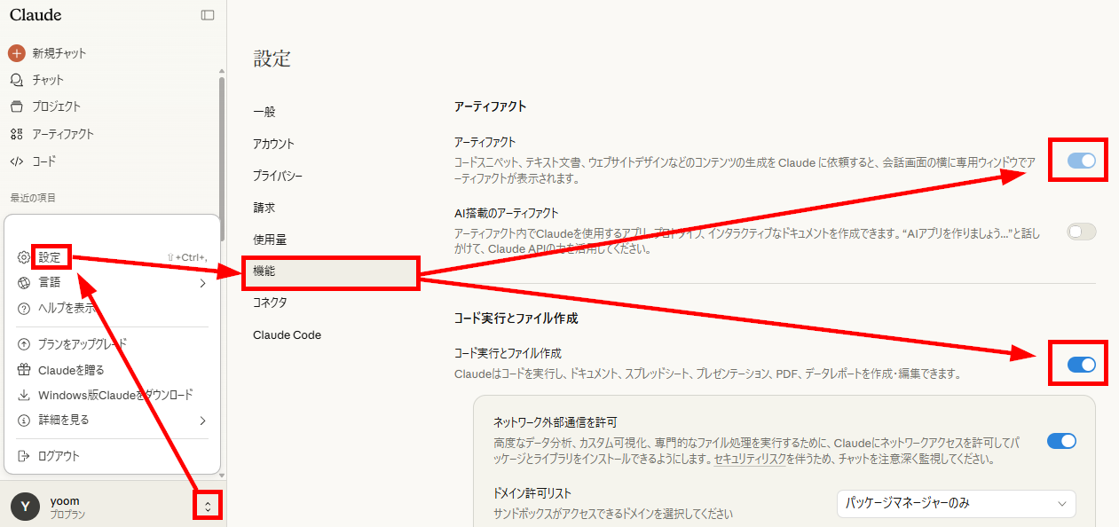Claudeの設定を開き、機能から必ず「アーティファクト」と「コード実行とファイル作成」のトグルをオンにしてください。