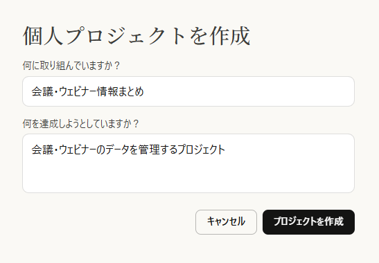 「何に取り組んでいますか?」「何を達成しようとしていますか?」を入力し、「プロジェクトを作成」をクリックします。