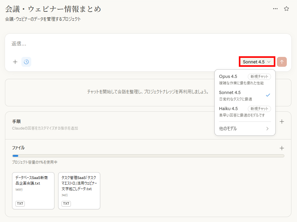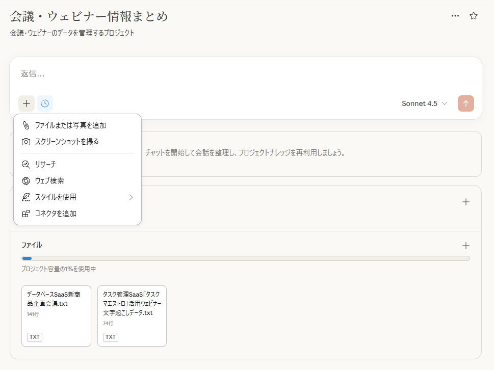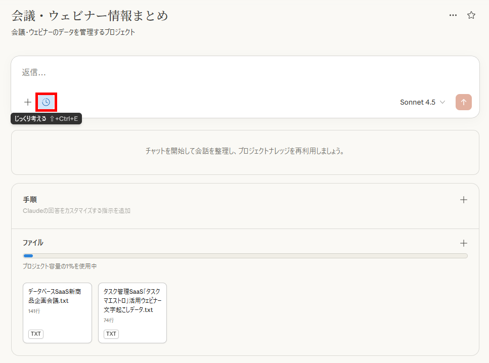 プロジェクトを利用する際は、通常のチャットのようにモデルの選択や「じっくり考える」機能の選択、ファイルの添付を行うことも可能です。