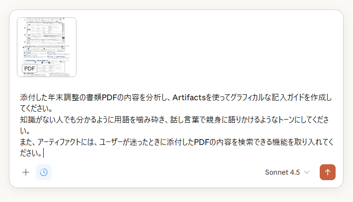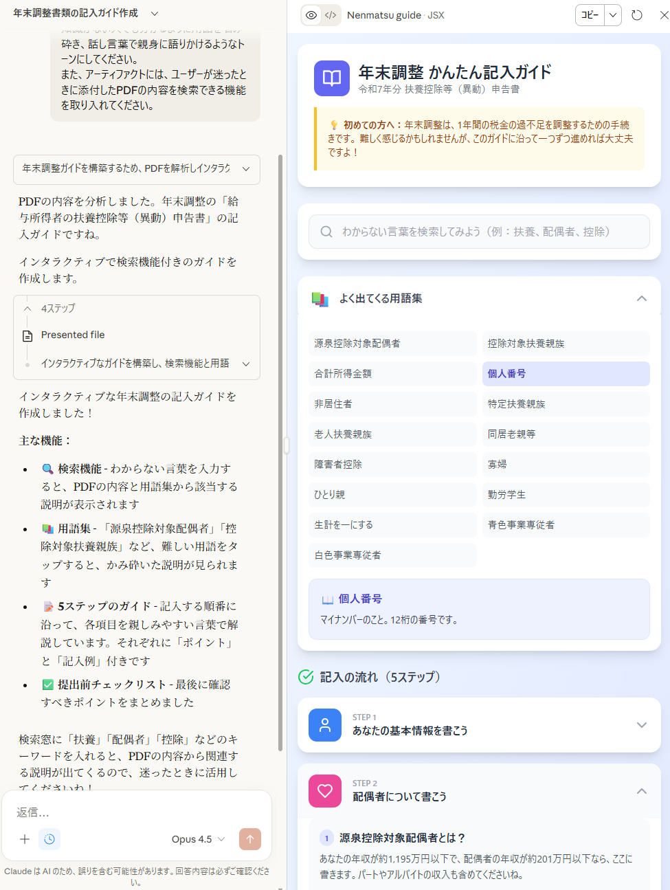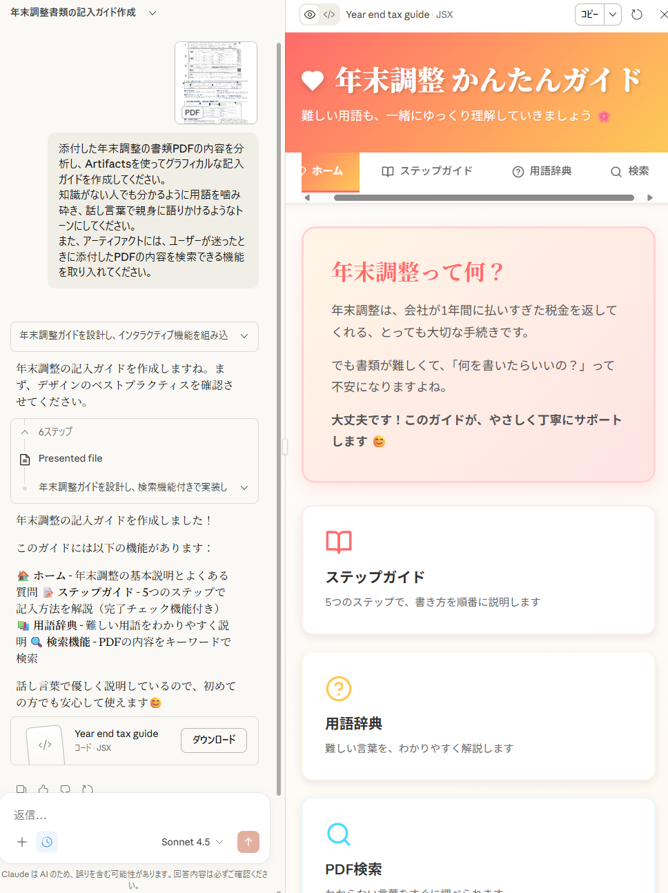 Claudeのコード実行とファイル作成機能を使えば、記入例や複雑な手引きを読み込ませるだけで、ステップ形式で入力内容を案内する「記入ナビゲーター」を作成できます。例えば、年末調整の書類などをステップバイステップで解説したマニュアルをプログラミング知識ゼロで作れます。