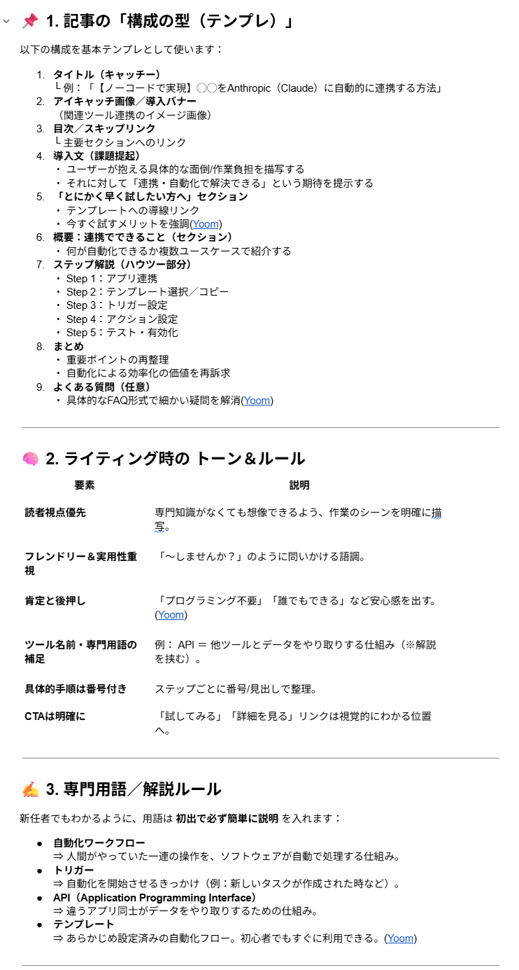あちこちに散らばった断片的な情報を、Claudeのプロジェクト機能に放り込むだけで、整った業務マニュアルへと一本化できます。「とりあえず箇条書きでいいので渡してください」と現場に伝えれば、AIが文脈を汲み取り、表記揺れを修正して、誰が読んでもわかる標準的な文章にリライトしてくれます。