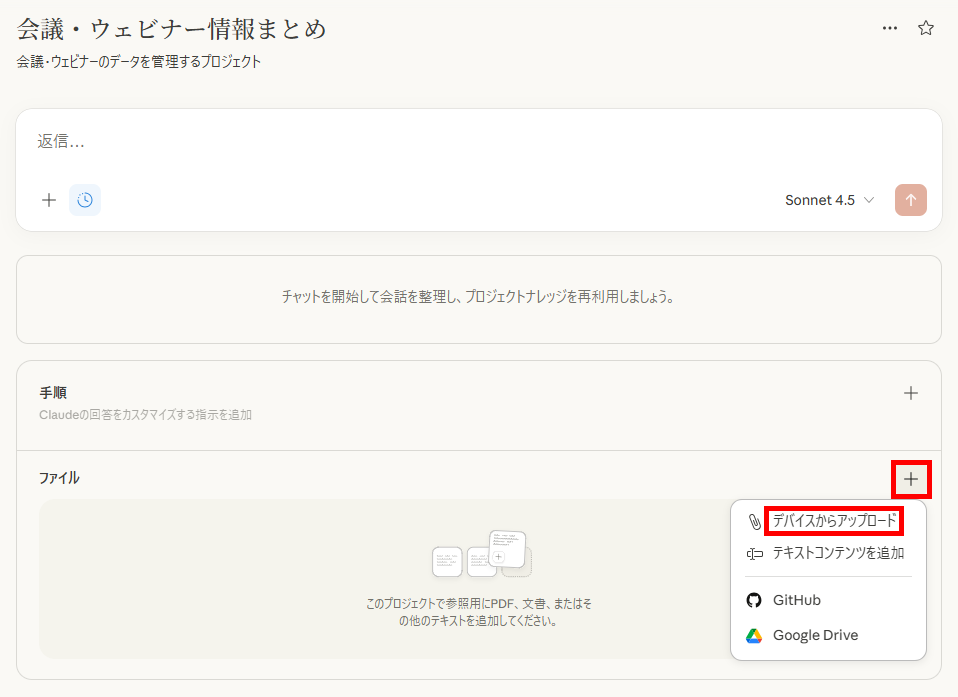 ファイル欄の「+」マークをクリックし、「デバイスをアップロード」からプロジェクトに追加したいファイルを選択します。
