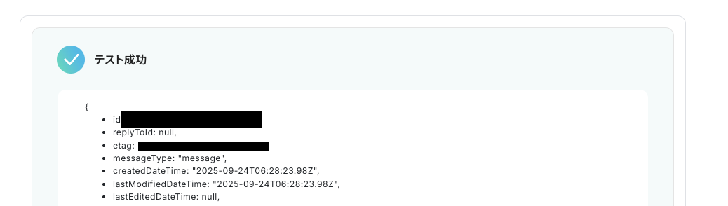 すると、以下のようにテスト成功、と表示されて投稿内容が取得できました。