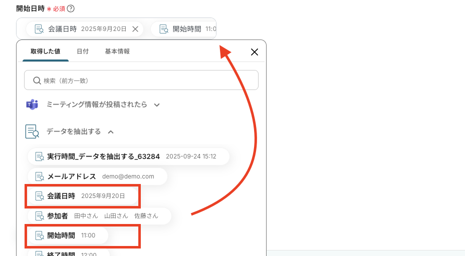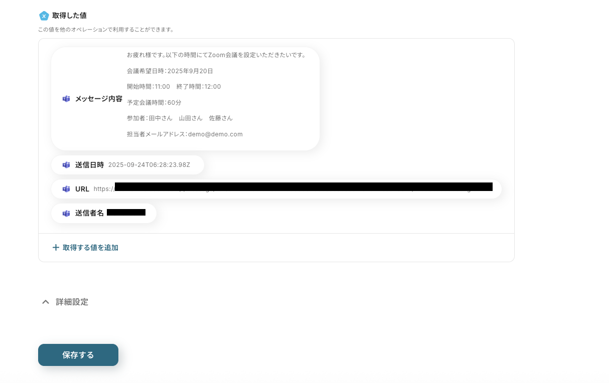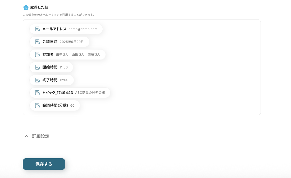 この後のステップで活用でき、Zoom会議作成のアクションで各項目に情報を設定する際、ここで取得した値をそのまま引用可能です。