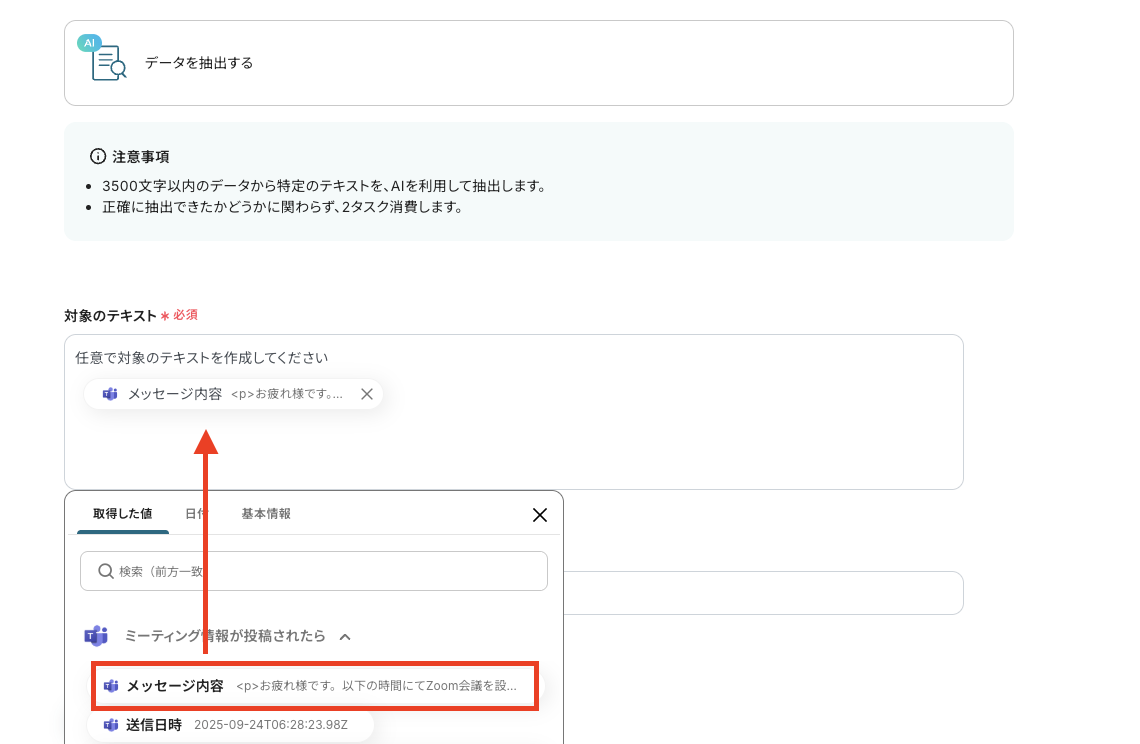 今回は、メッセージ内容から必要情報を抽出しているため、2つ目のステップで取得した値を引用していきましょう。