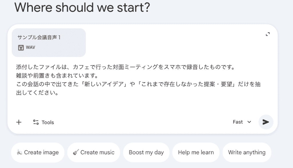 「これは新商品のマーケティング施策を決める会議です」と一言添えるだけで、Geminiは専門用語の解釈や何が重要かの判断をより適切に行えるようになります。