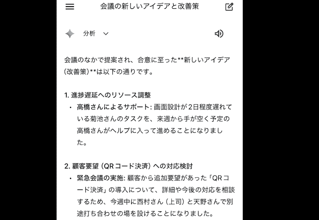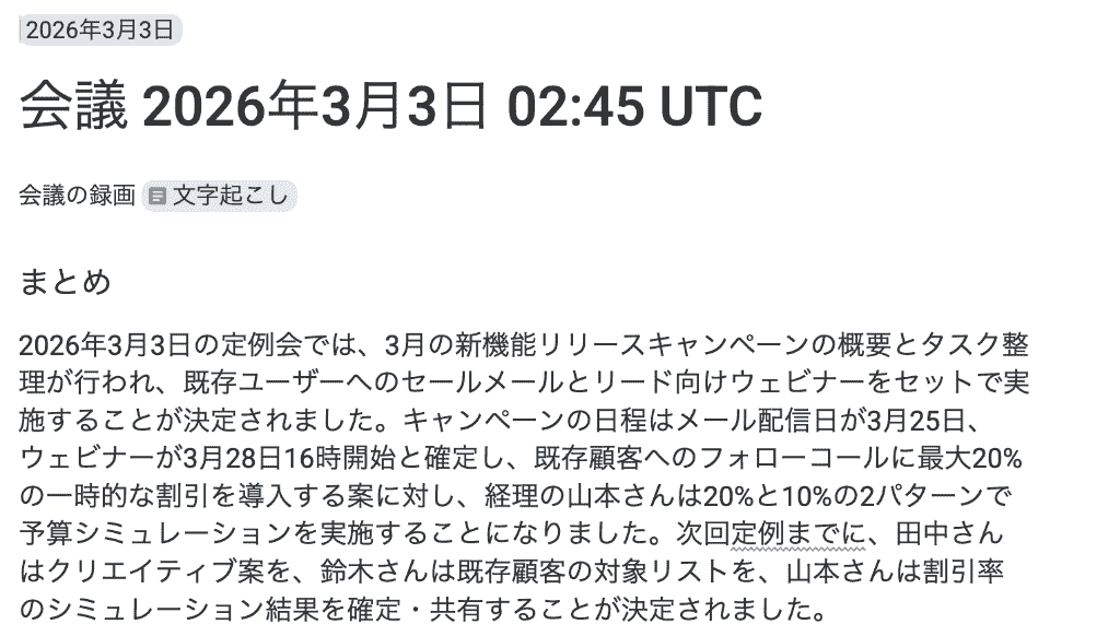 保存された文字起こしドキュメントをGeminiに読み込ませ、「この会議の決定事項と、担当者ごとのタスクを箇条書きで抽出して」と指示を出しました。