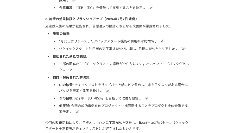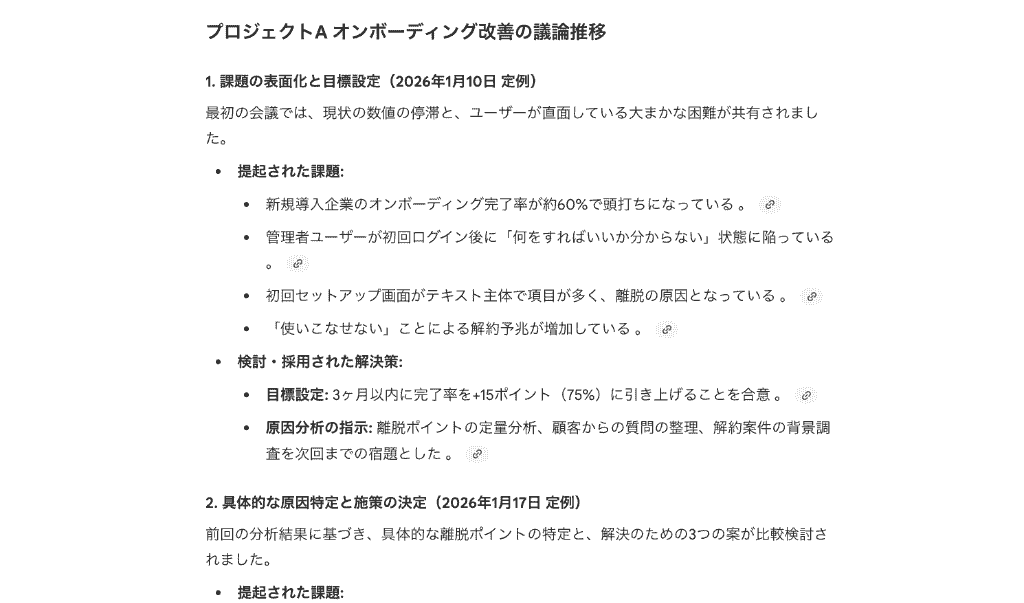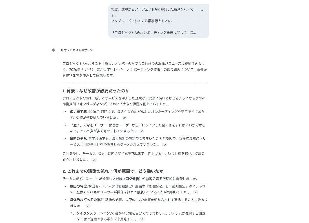新しくプロジェクトに参加したメンバーも、これなら過去の経緯を誰かに聞くことなく、自分でAIに聞いてキャッチアップできますね。