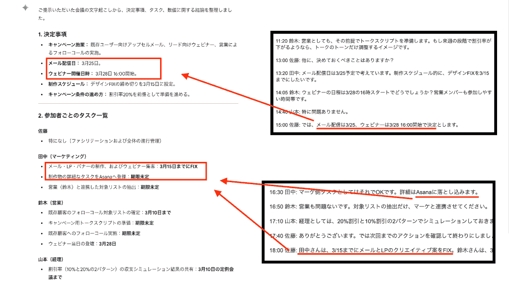 また、議論の行ったり来たりも正確に把握し、「制作スケジュール: デザインFIXの締め切りを3月15日に設定」と結論のみをスパッと提示してくれています。