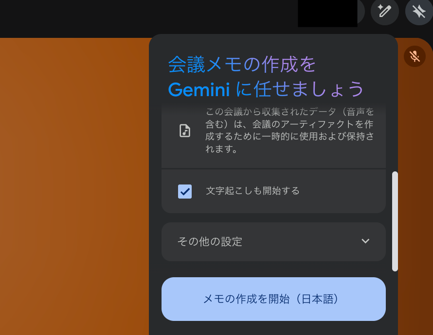 ※Google 管理コンソールにて[Google AI のメモ作成機能を会議で使用できるようにします] のチェックボックスをオンにしておく必要があります。