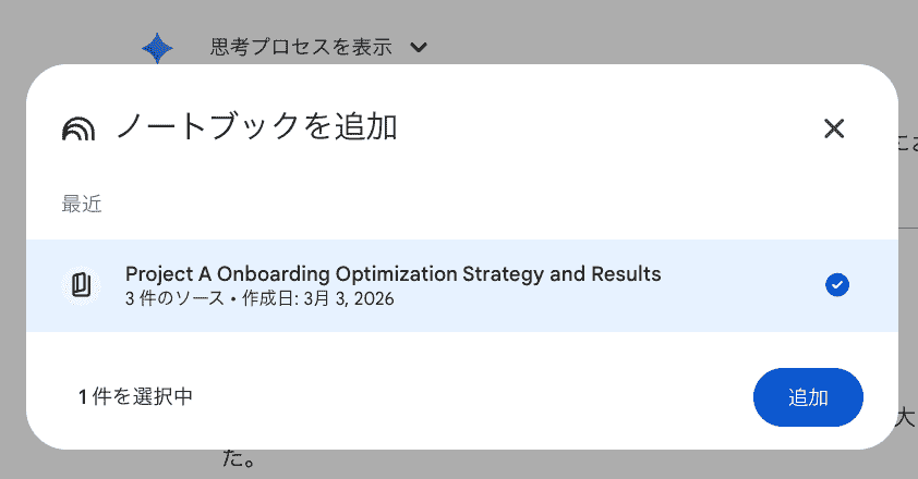 アップロード後にGeminiに戻ると、新規のノートブックとして選択できるようになっているので、チェックを入れて「追加」をクリック。