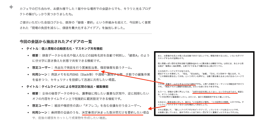 さらに、雑談部分は見事にカットされ、キラリと光るアイデアの部分だけがリストアップされました。(赤線)