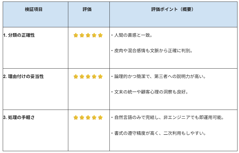 本検証の目的は、LLM(大規模言語モデル)を用いたカスタマーレビューの自動感情分析において、「分析精度の信頼性」と「現場での実用性」を多角的に評価することです。