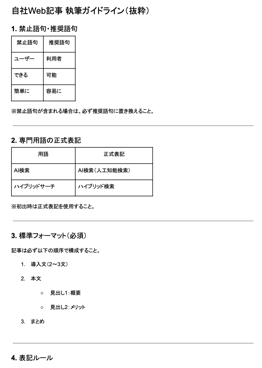 - 出力結果が、人間の編集者によるチェックをパスできるレベルで「自社ルール」を反映できているか