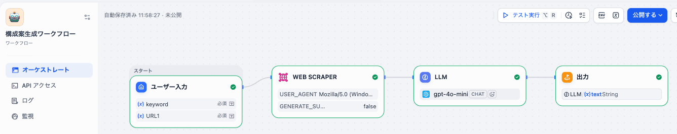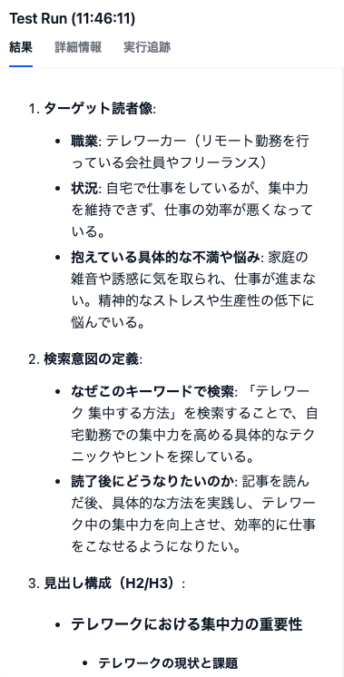 どちらのフローも、指示したフォーマットに沿った構成案を出力できていました!