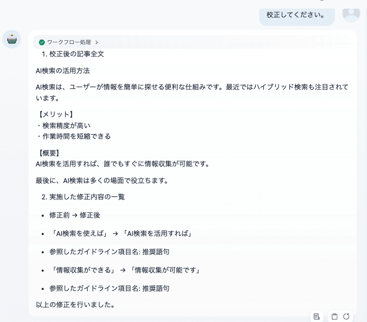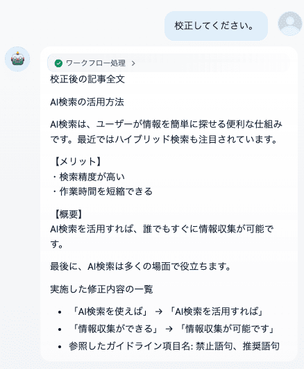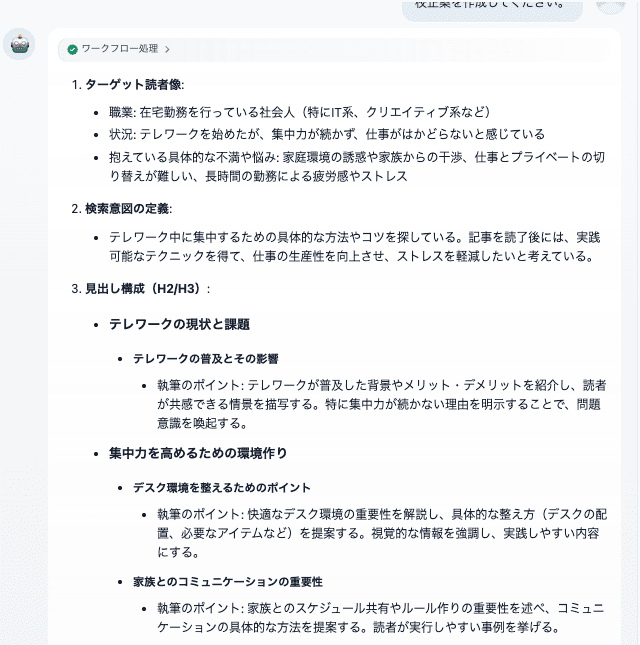 その点、チャットフローは会話の流れを保持できるため、「この見出しだけ少し直したい」といった追加の要望にも柔軟に対応できます。細かな調整を重ねたい場面では、チャットフローの使い勝手の良さが活きてきます。