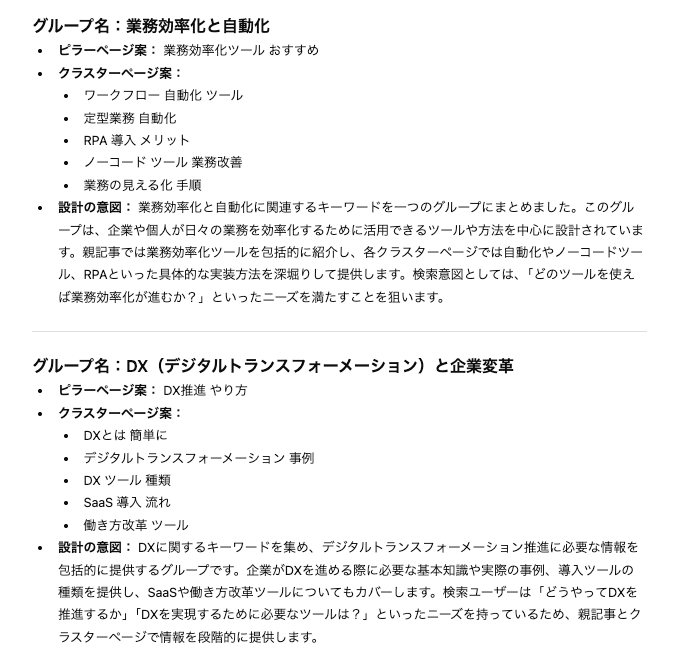 結論として、表記揺れの統合やピラー選定は実用レベルですが、課題解決の導線設計(悩みと解決策の紐付け)には文脈理解の甘さがあり、手動修正が必要です。