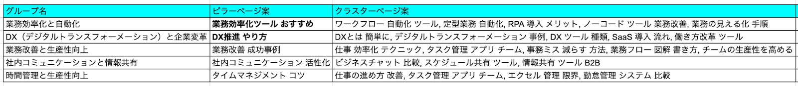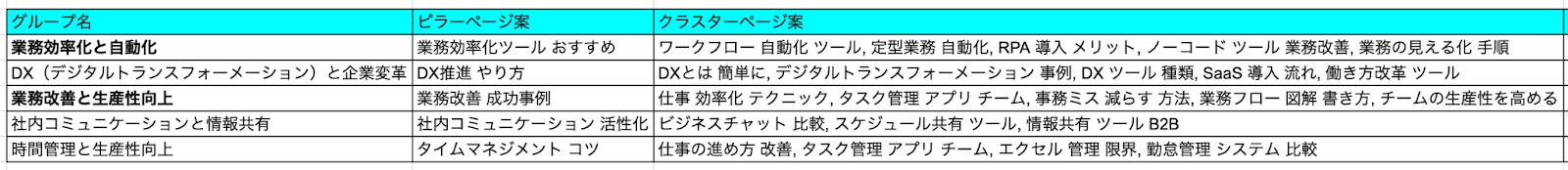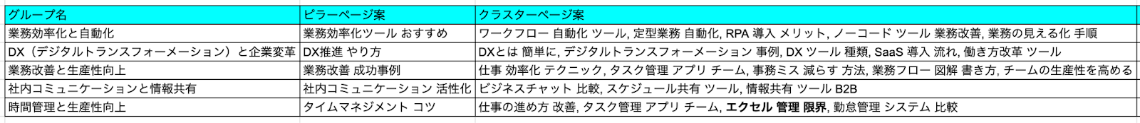 「業務効率化」と「業務改善」を別グループに分けましたが、検索意図が重複するため統合すべきです。さらに、「エクセル 管理 限界」が「時間管理」グループに分類されていますが、システム導入(DX)へ誘導すべきキーワードであり、戦略的な配置転換が必要です。