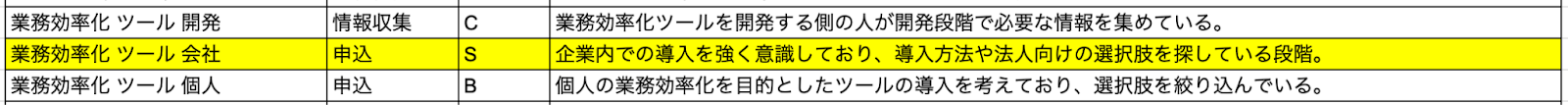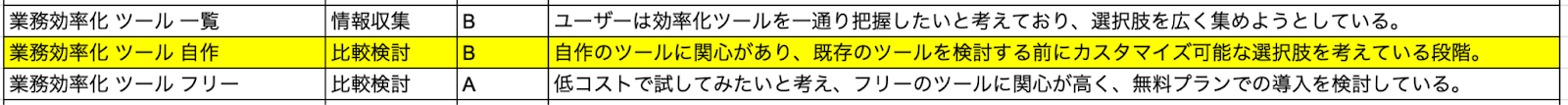| (例)業務効率化 ツール 無料 | 比較検討 | A | コストを抑えてスモールスタートしたい意図があり、フリープランのあるツールへの登録確度が高い |