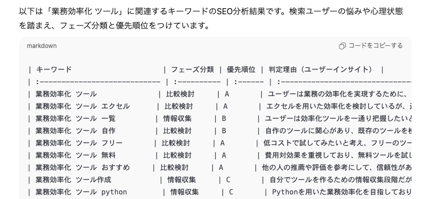 また、「業務効率化 ツール 自作」「業務効率化 ツール Python」といったキーワードは、本来「費用をかけたくない層」ですが、Bランクと高めに評価されました。これらはリード獲得観点ではCランク(低)が妥当です。