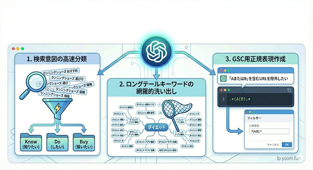 ChatGPTをSEOキーワード選定に活用することで、具体的にどのような業務が可能になるのでしょうか。ここでは、特に効果が高い3つの活用法を紹介します。