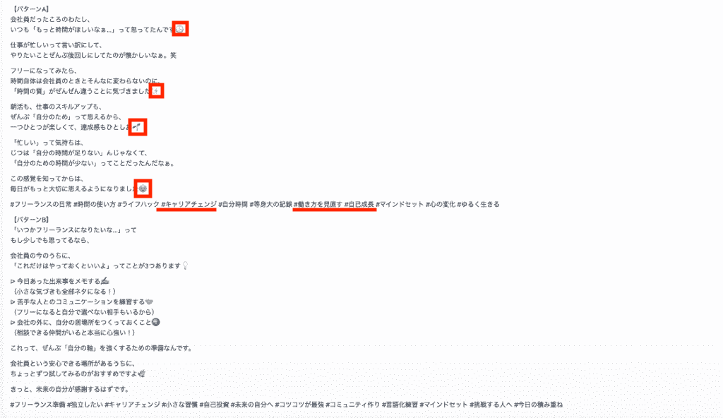 ハッシュタグも変更されていますが、こっちの方がテーマの『会社員時代とフリーランスで働いている今を比べて』似合っているような気がします!(赤線)